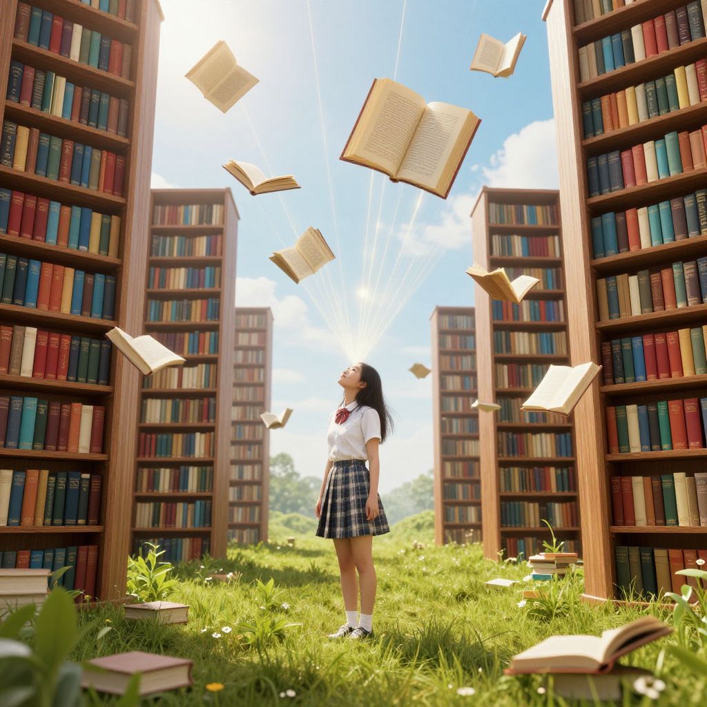 A young woman stands amidst a vibrant meadow, surrounded by towering bookshelves brimming with colorful volumes, as numerous open books float gracefully in the sky above her, illuminated by ethereal light and suspended by golden threads, creating a whimsical scene where knowledge and imagination intertwine.