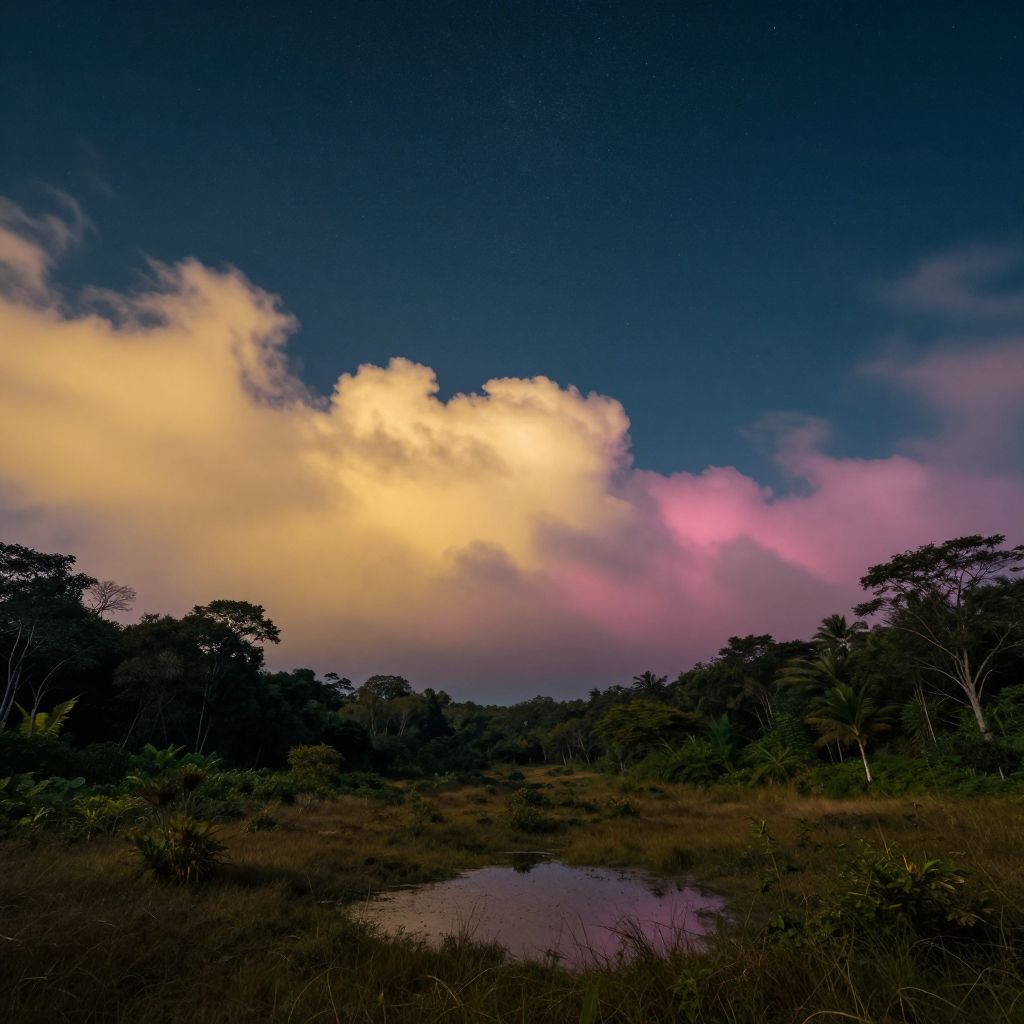 Random perspective, f/4.5, <8k, high detail, uhd, sharp focus, palette, photorealistic, absurdres, extreme detail, as much detail as possible, extremely high visibility>, muted yellow, dark teal, matte indigo, dark violet, matte pink, (a mesmerizing scenery of clouds and stars showing a natural landscape:1.3), celestial objects in a beautiful sky, woodland, jungle, puddles, shrubland, afternoon, (rain:0.5), the most beautiful image in the world