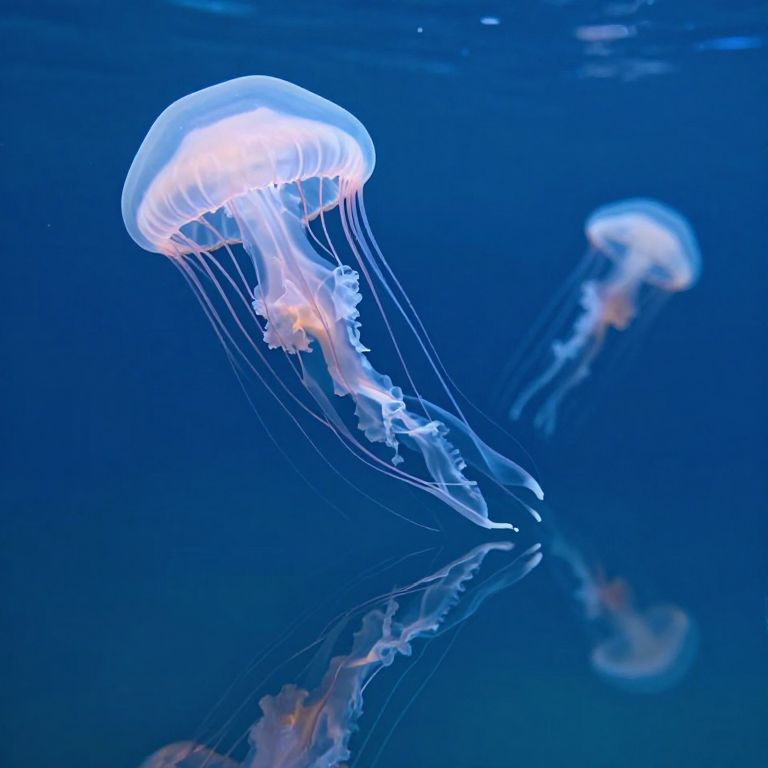 Amidst the ethereal glow of sunbeams piercing the abyss, translucent jellyfish drift gracefully, their rhythmic pulsations echoing ancient whispers of serenity and the timeless dance of existence.