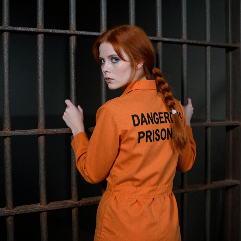Photograph of a red-haired woman in an orange "Danger Prisoner" jumpsuit, standing against black metal bars, looking back with a serious expression
