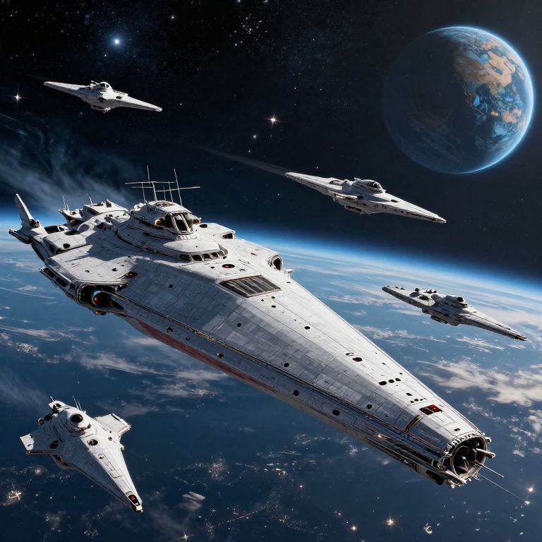 Photorealistic digital artwork of a white, triangular space battleship with four smaller ships, flying above Earth in a starry, deep space backdrop.