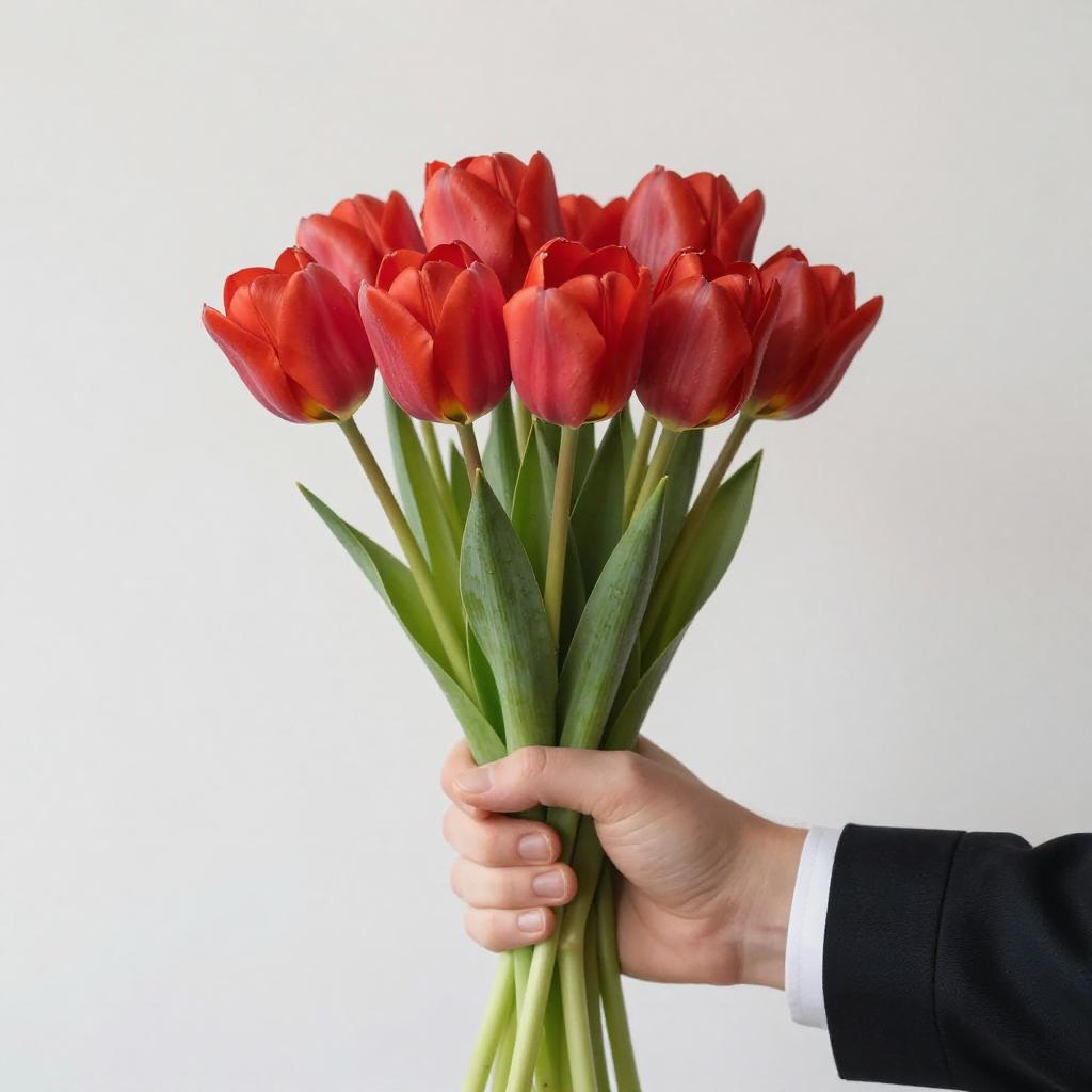 Photograph of a hand with light skin, wearing a black suit sleeve and white shirt cuff, holding a bouquet of vibrant red tulips with green stems and leaves. The hand is positioned on the right side, slightly angled towards the camera. The background is completely white and blurred, creating a shallow depth of field that keeps the focus on the hand and tulips. The lighting is even and bright, with no shadows. The camera angle is straight-on.