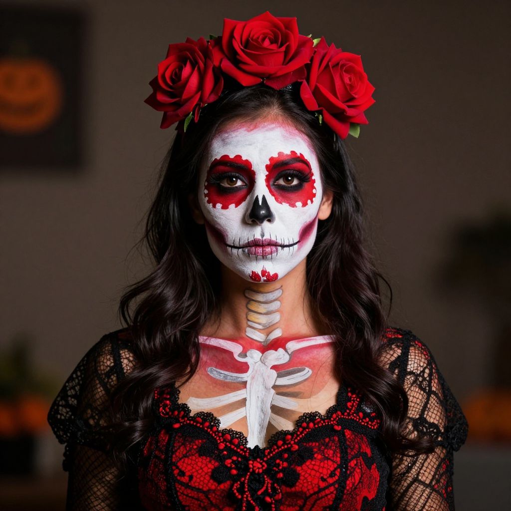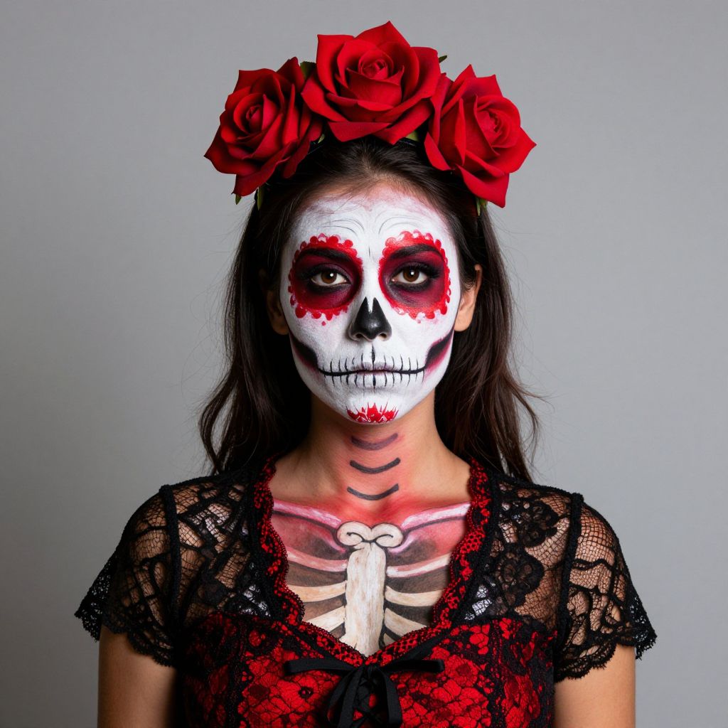 Woman wearing a vibrant Day of the Dead costume featuring a skeletal face painted in bold red and white, adorned with three large red roses atop her head, paired with a black and red lace top that reveals a detailed skeleton design on her chest, exuding a haunting yet festive Halloween theme.
