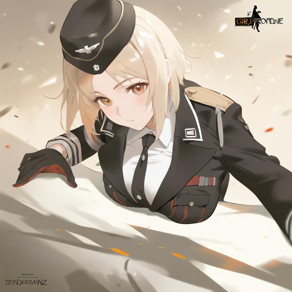 Mp40 (girls' frontline), girls' frontline, 1girl, brown eyes, blonde hair, short hair, large breasts, military uniform, garrison cap, military uniform, black gloves, military hat, white shirt, black headwear, long sleeves, by artist sendo (sendrawz), animagine