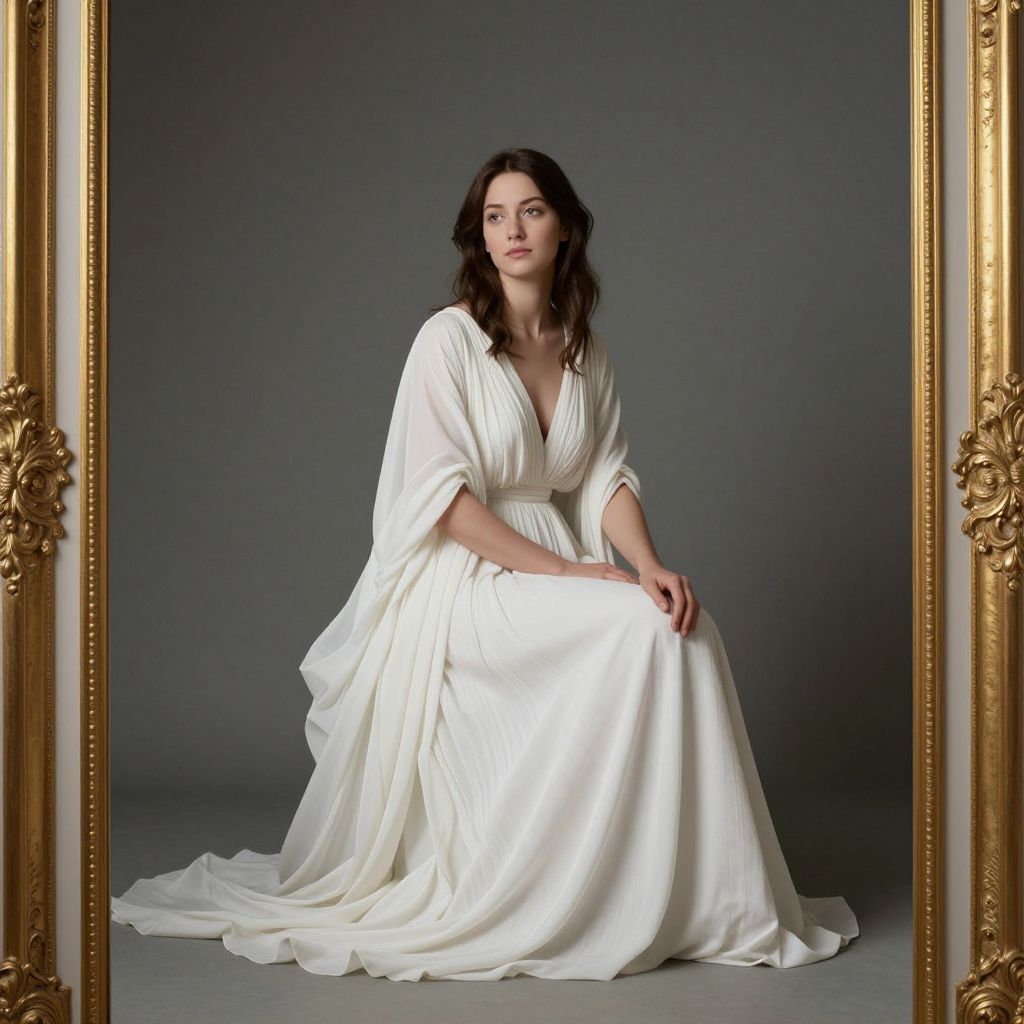 Elegant woman seated in a flowing white gown, captured in a serene pose against a muted gray backdrop, framed by ornate golden detailing, evoking the timeless grace of Sir Lawrence Alma-Tadema's \"An Eloquent Silence\" (1890).