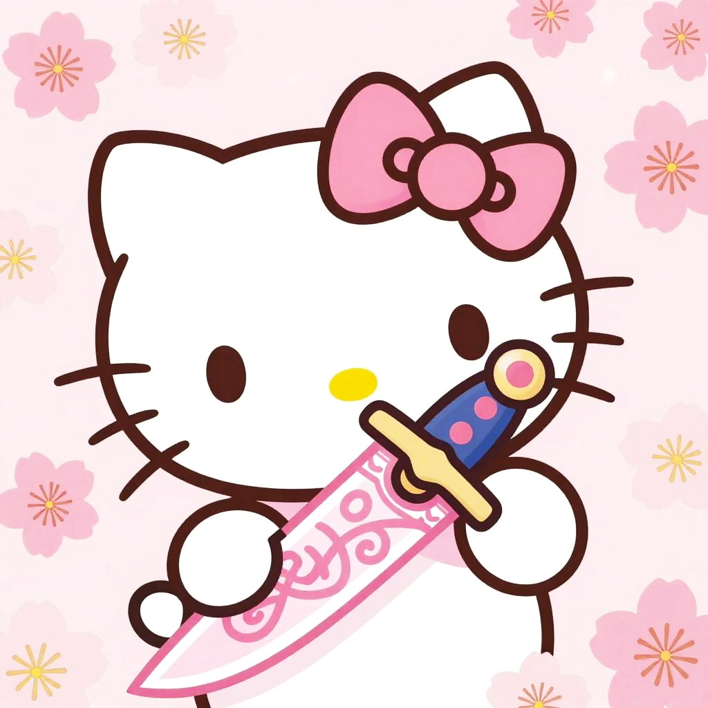 Hello Kitty dagger with a cute pink blade, intricate kawaii design, surrounded by cherry blossoms, soft pastel colors, fantasy anime style, high detail close-up