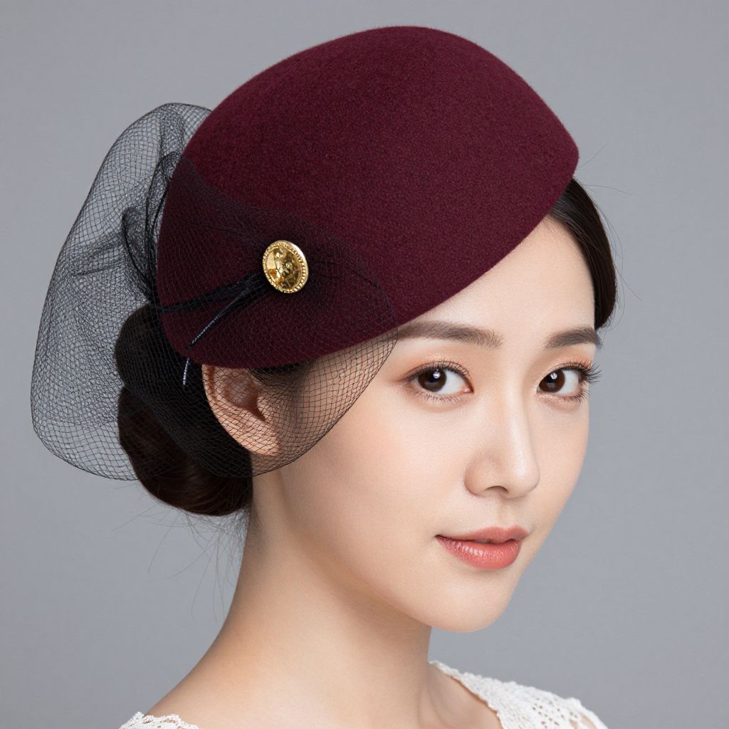 Woman wearing a stylish burgundy pillbox hat adorned with a gold button and sheer veil, complementing her elegant bridal look.
