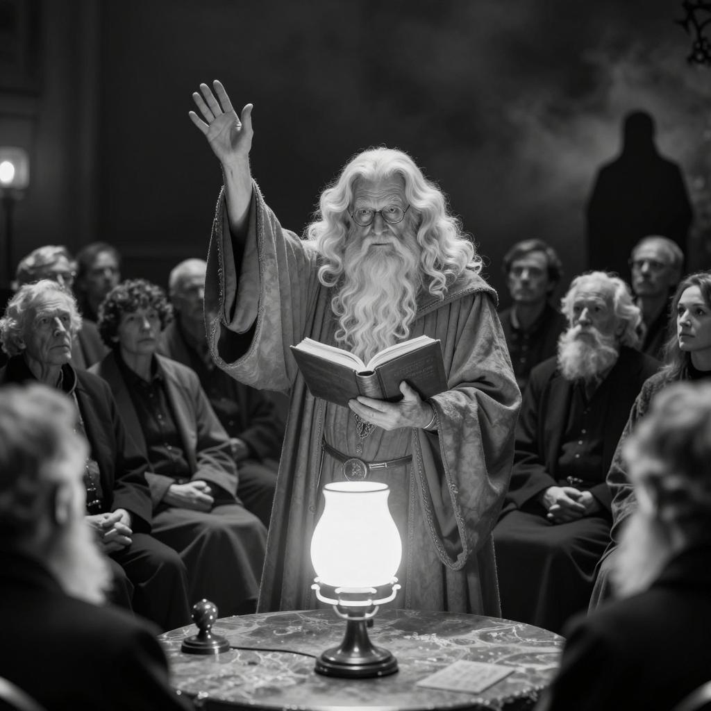 Black and white photograph. Elder wizard with long, curly white beard and robe, right arm raised, left arm holding open book. Audience of 15 people, mostly elderly, focused on wizard. Bright lamp with ringed shade on table in foreground. Wizard in center, audience to left and right. Smoky background. Silhouetted figure on far right.