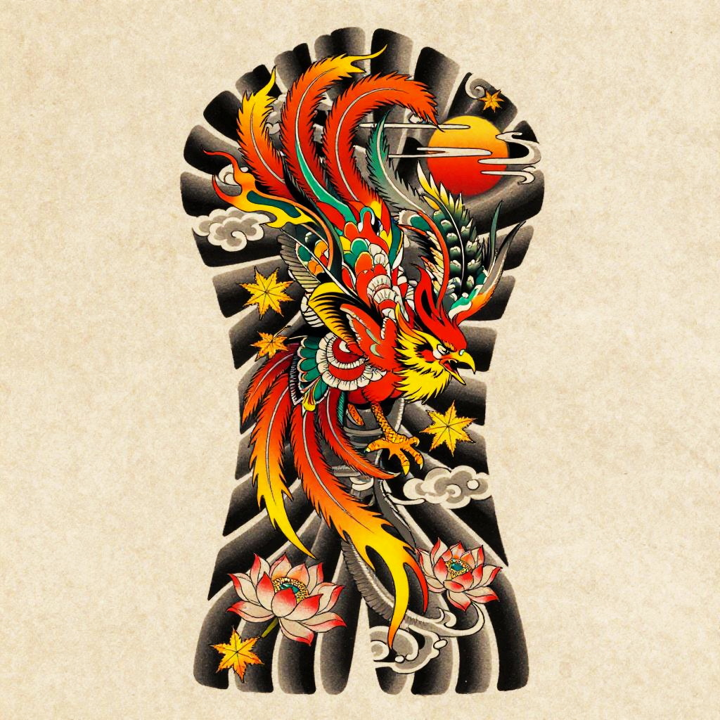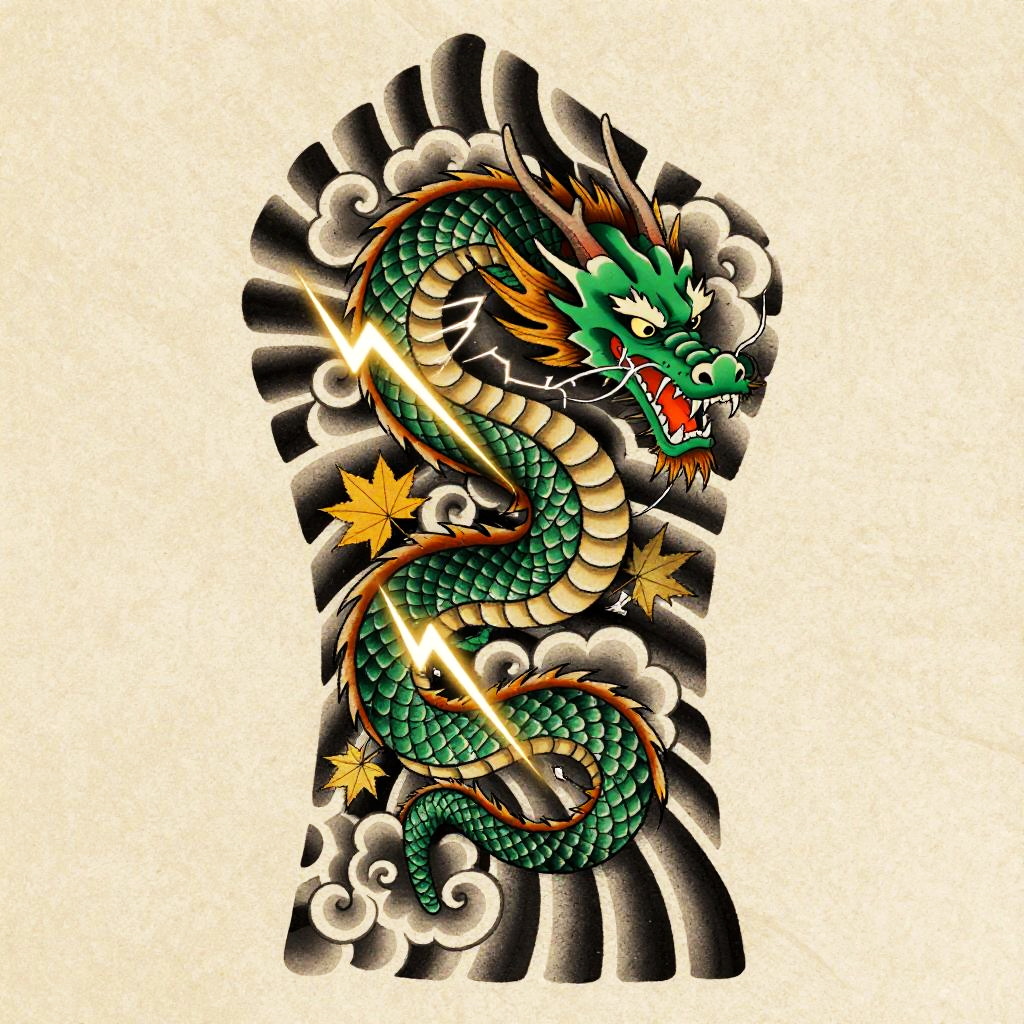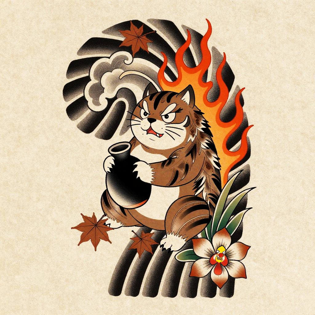 Anime irezumi tattoo flash of playful tanuki holding a sake jug, bold black outlines, cel-shaded depth, ornate feather or scale detailing, roaring flames and wind bars, ukiyo-e woodblock influence, dynamic S-curve energy, maple leaves, wind bars, orchids, saturated inks with smooth gradient fills, crisp linework, tebori texture cues, clean negative space, paper grain texture, high detail, burnt sienna, soft olive, cream highlights, tattoo stencil overlay, studio-soft background, 8k, gallery ready, sharp focus.
