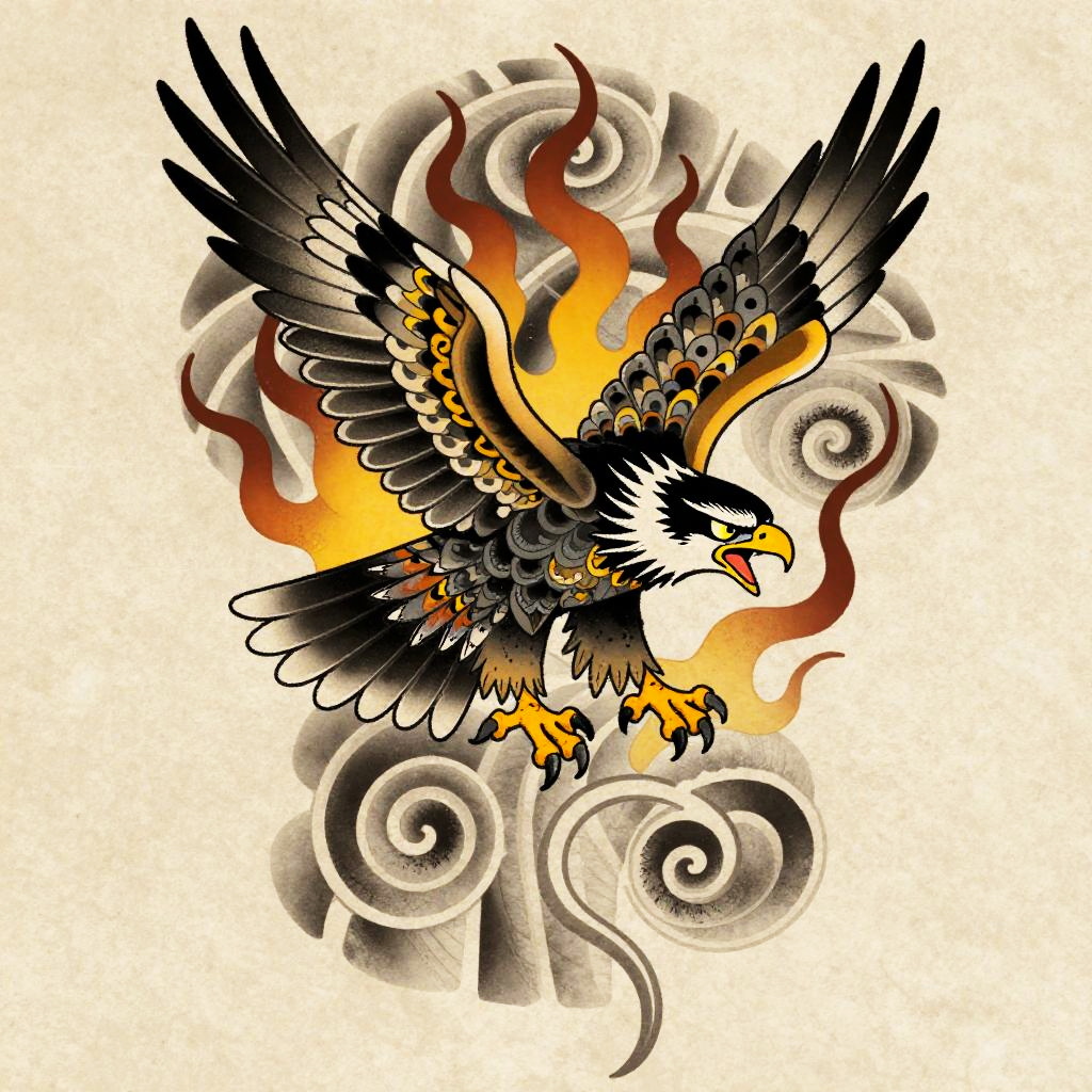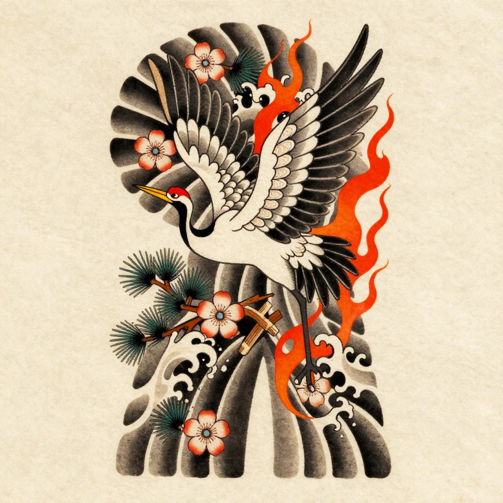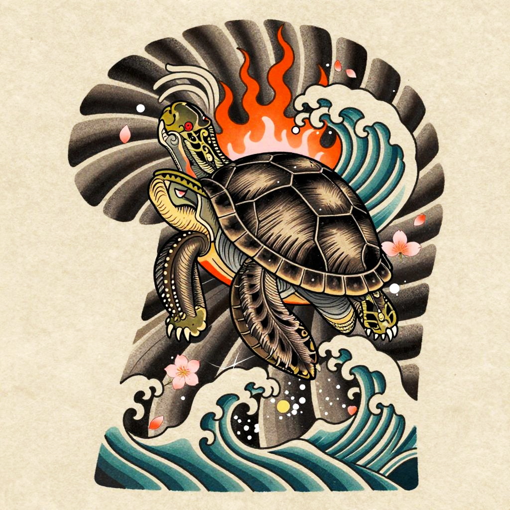 Anime irezumi tattoo flash of playful tanuki holding a sake jug, bold black outlines, cel-shaded depth, ornate feather or scale detailing, roaring flames and wind bars, ukiyo-e woodblock influence, dynamic S-curve energy, maple leaves, wind bars, orchids, saturated inks with smooth gradient fills, crisp linework, tebori texture cues, clean negative space, paper grain texture, high detail, burnt sienna, soft olive, cream highlights, tattoo stencil overlay, studio-soft background, 8k, gallery ready, sharp focus.