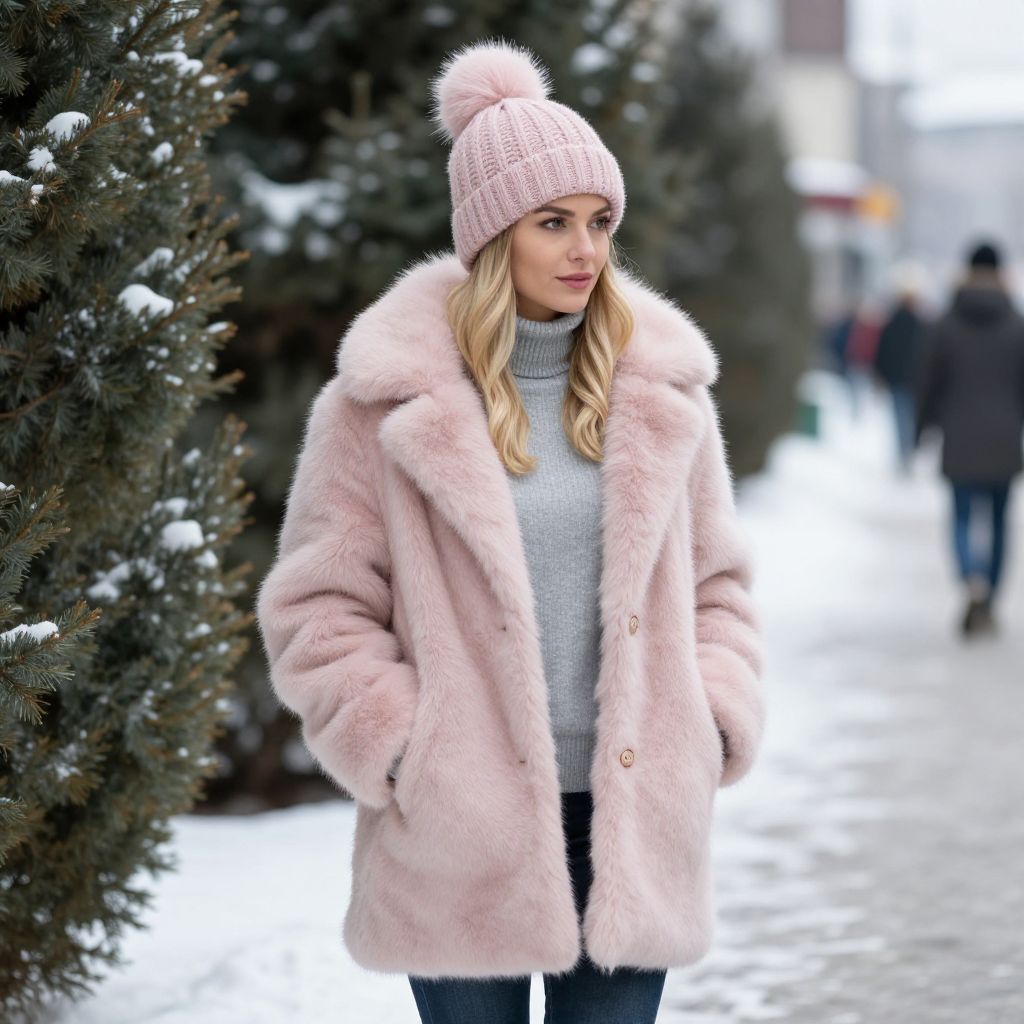 Blonde woman wearing a cozy winter ensemble featuring a blush pink fur coat with plush trim, a matching knit beanie adorned with a fluffy pom-pom, and a gray turtleneck sweater, standing outdoors on a snowy street lined with evergreen trees and blurred pedestrians in the background.