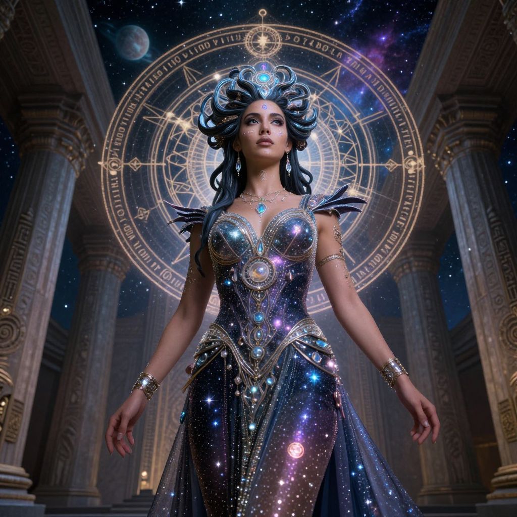 Digital artwork of a celestial goddess with dark hair, wearing a shimmering, star-embellished dress, standing in an ancient, cosmic temple.