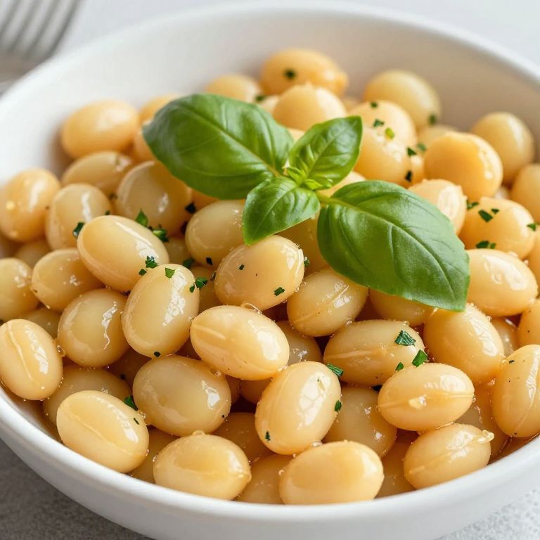 Golden butter beans glisten in a shallow white bowl, garnished with fresh basil leaves and finely chopped herbs, creating a vibrant and appetizing presentation.