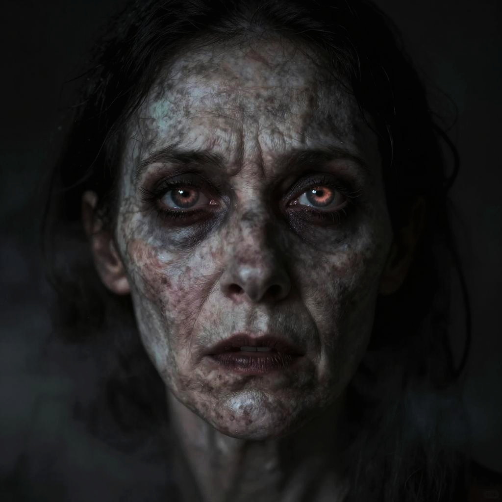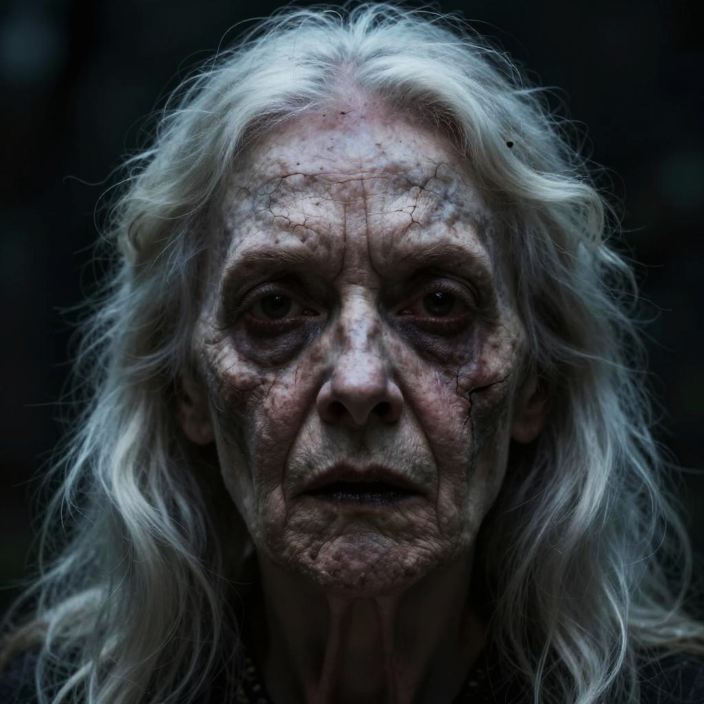 Close-up of a scary old woman face, cracked skin, sunken cheeks, wild white hair, malevolent expression, dark background, cinematic lighting, supernatural horror vibe