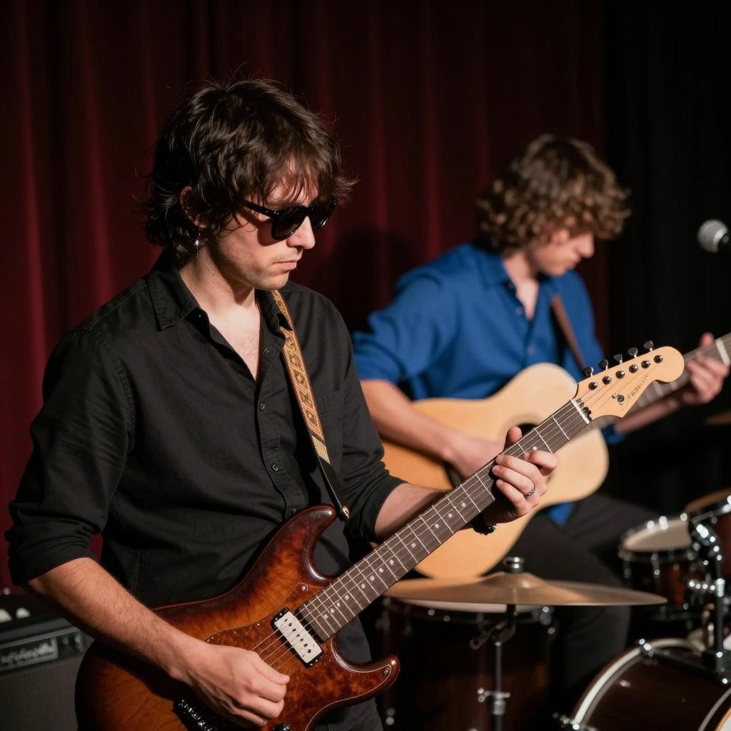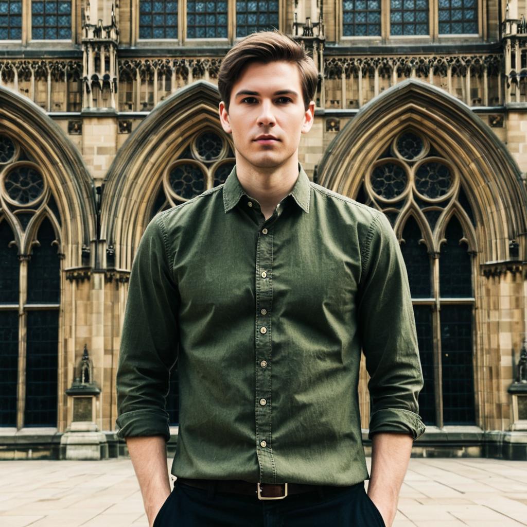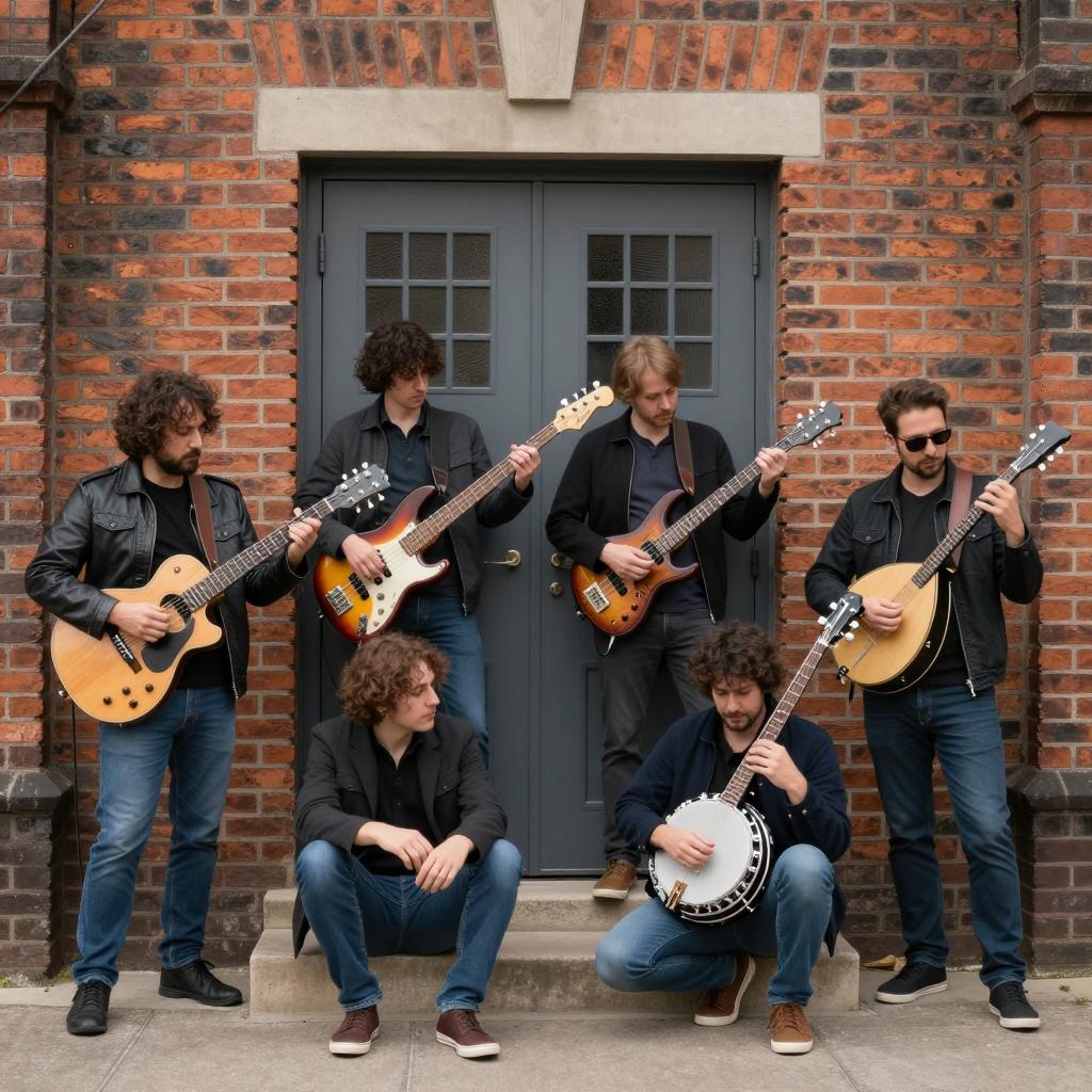 Five men in dark jackets sit and lean on a metal bridge with arched supports. Four are on the bridge's edge, one sits higher. Sunlight casts shadows. Background includes green trees, cobblestone path, and gothic-style buildings. Foreground man looks to the left. All men wear sunglasses.