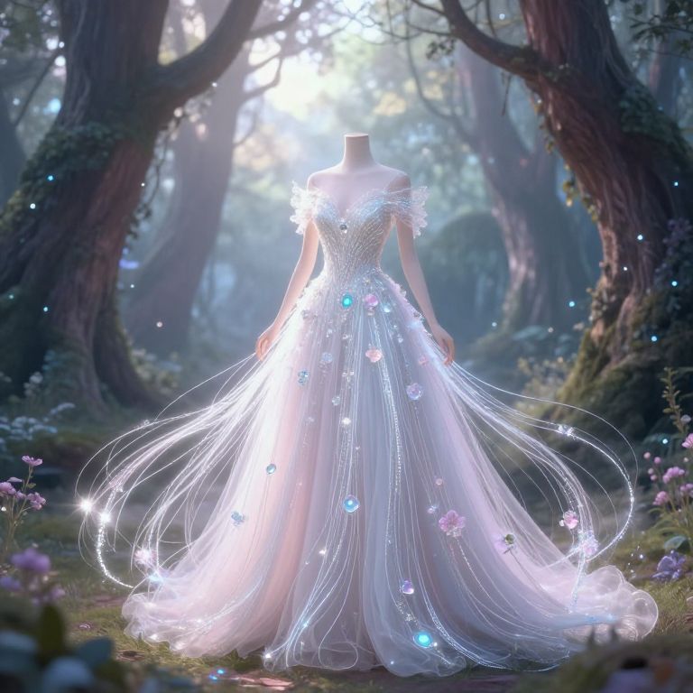 Fantasy dress art featuring an ethereal gown woven from glowing silver strands and delicate floral motifs, set against a mystical forest backdrop with shimmering light filtering through ancient trees, soft pastels and vibrant jewel tones blending seamlessly.