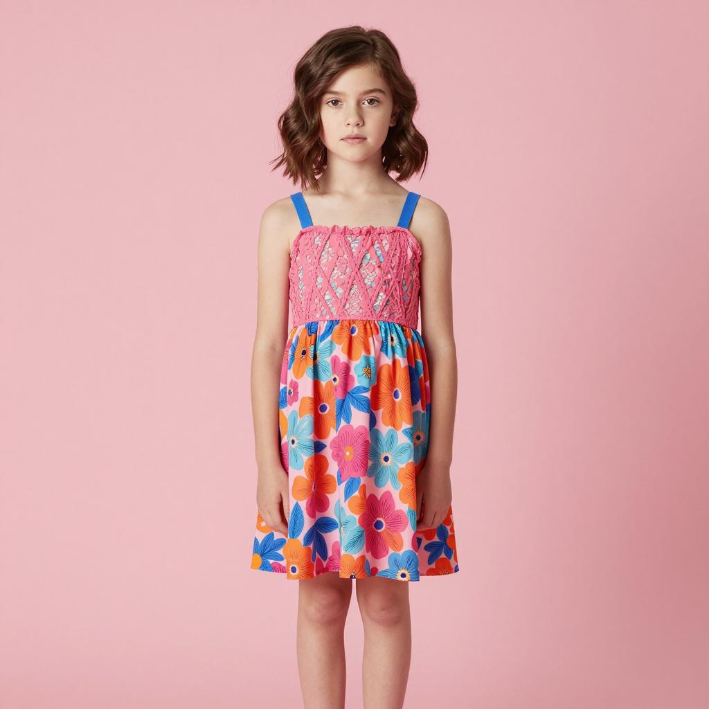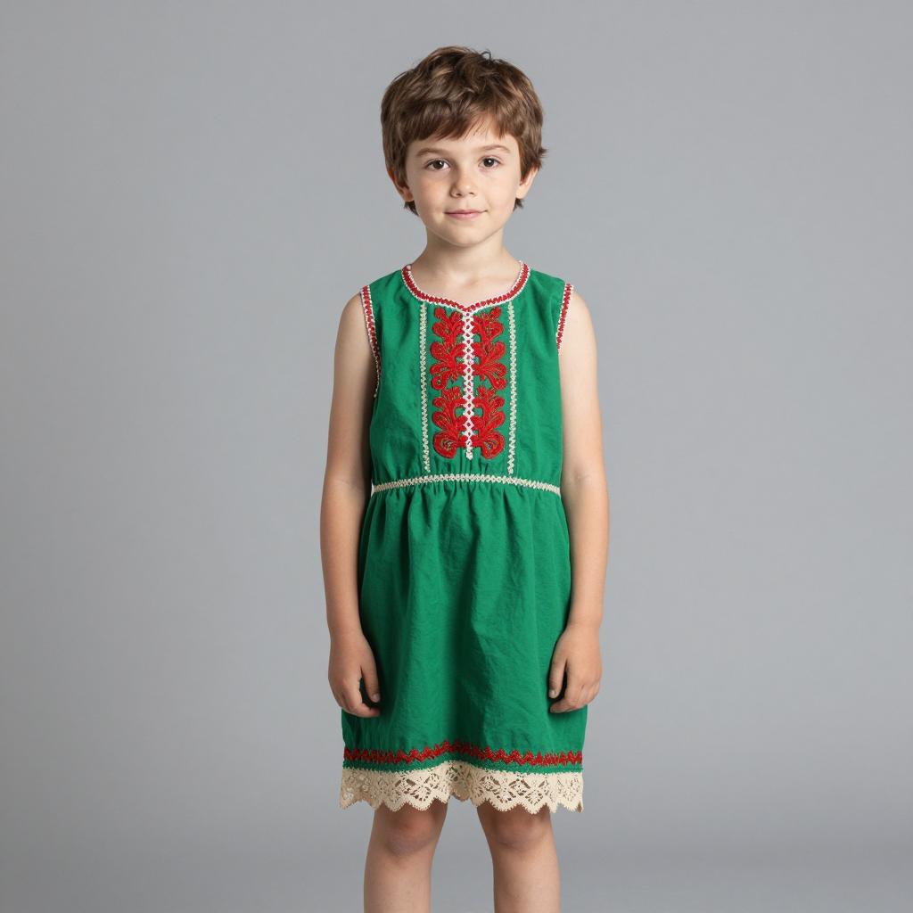 Kids costume boys, photograph of young boy, standing, facing camera, short brown hair, green sleeveless dress, red embroidered design on chest and waist, green and red lace trim at bottom, beige lace underskirt, neutral gray background, simple lighting, soft shadow, realistic style, casual pose, studio setting, child's dress, traditional embroidery, light skin tone