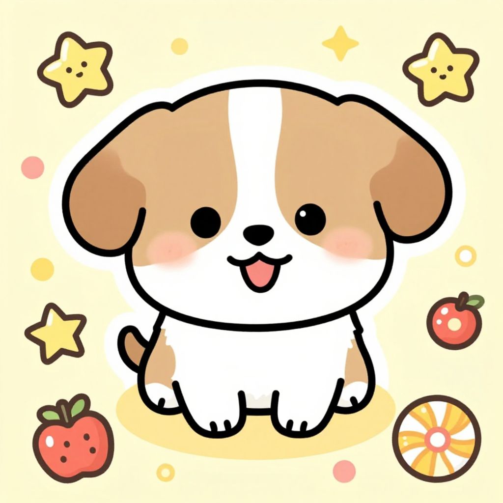 Cute little dog drawing in a chibi anime style, oversized head and tiny paws, bright colors with bold outlines, surrounded by toys and sweets, cheerful and energetic vibe, perfect for a children's book illustration or greeting card