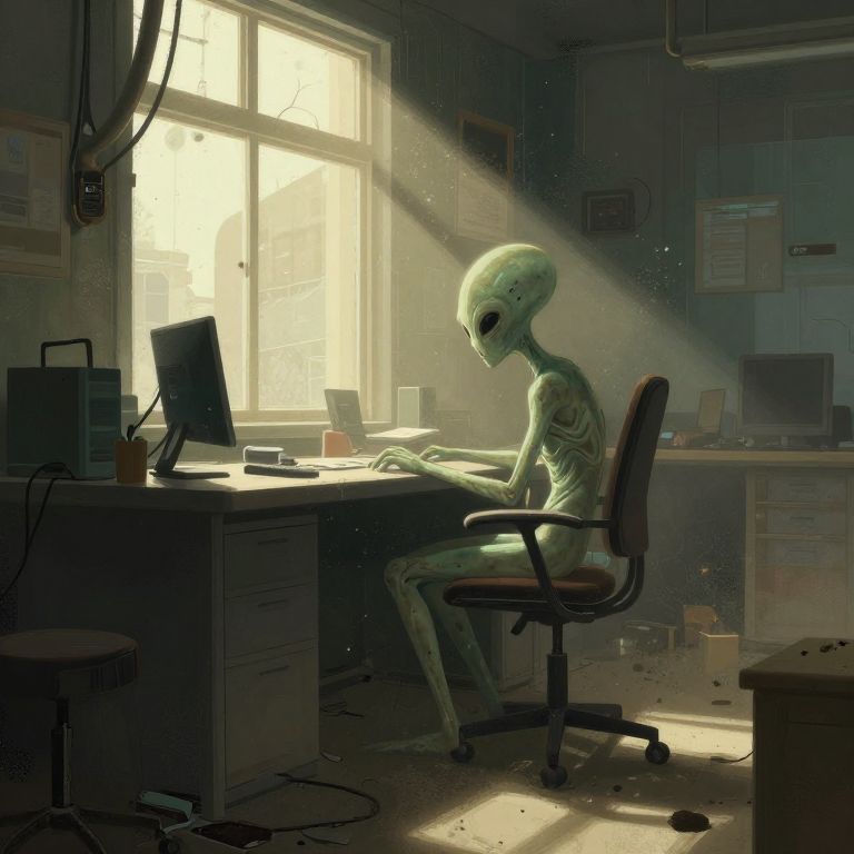 Corroded syd mead style abstract illustration of a lonely alien sat at a desk in a run-down cyberpunk office sunlight coming through window and dust in the air,