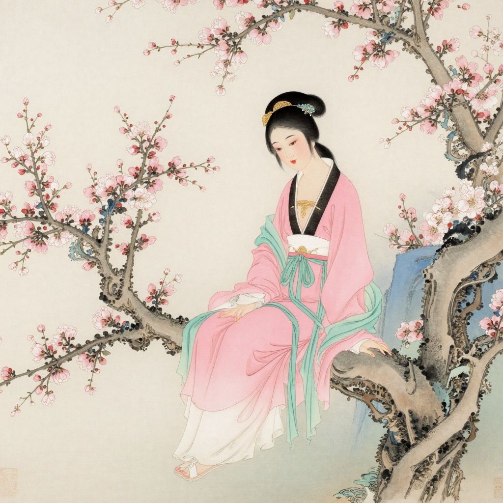 A delicate digital illustration inspired by traditional Chinese art, featuring a woman in flowing pink and teal robes gracefully seated on a blossoming tree branch, evoking the serene beauty and elegance characteristic of Feng Chiang-Jiang's paintings.