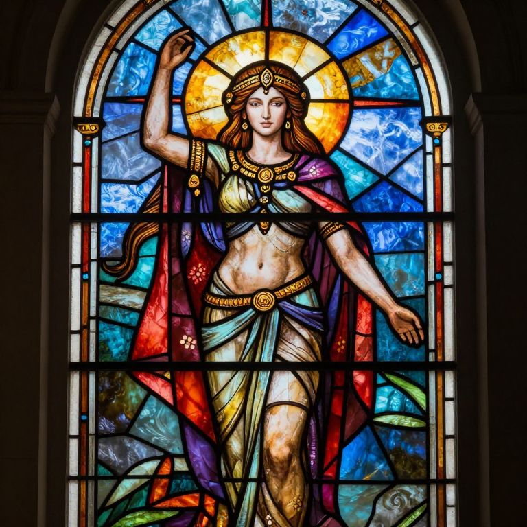 Stained glass window of a goddess with long brown hair, gold headpiece, and red and purple draped garments, set against a vibrant blue and yellow
