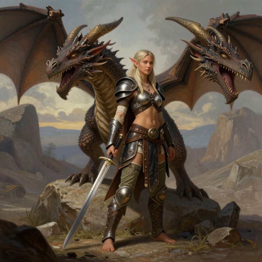 Digital fantasy artwork of a blonde, armored elf with pointed ears, standing confidently with a sword, flanked by two black dragons in a rocky, mountain