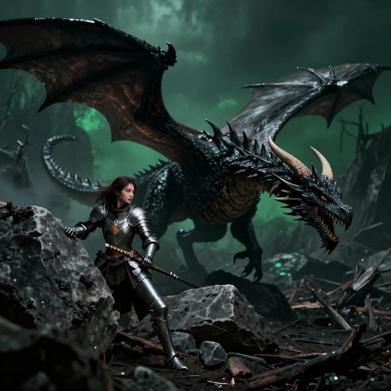 Digital fantasy artwork depicting a fierce, blonde, elven woman with pointed ears, standing on rocky terrain. She wears black, metallic armor with a leather belt and green leggings, holding a gleaming sword in her right hand. A massive, black dragon with golden horns and wings stands protectively behind her, its mouth open, revealing sharp teeth. The background features a mountainous landscape with a cloudy, yet bright sky. The dragon's scales and the woman's determined expression create a powerful, epic scene. The art style is highly detailed and realistic, emphasizing the fantasy elements.
