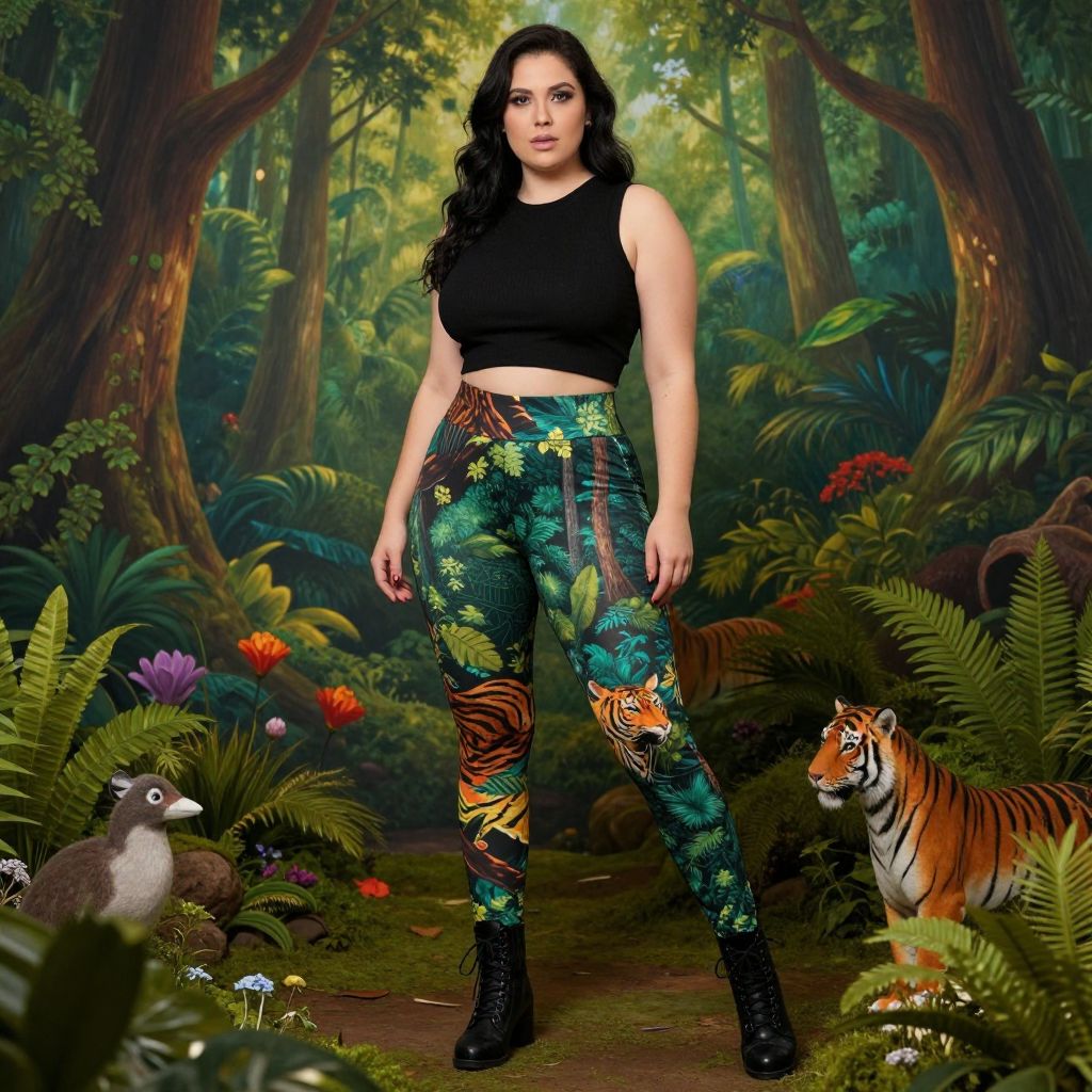 A lanky woman, in Diego Fazio's hyper-realistic style, wearing a black sleeveless crop top, high-waisted leggings with vibrant forest and tiger print, and black lace-up ankle boots, stands in an enchanting forest glade. She is admiring the lush surroundings, blending seamlessly with the vibrant foliage and wildlife. Sexy. Pretty face and beаutiful eyes. Big breasts