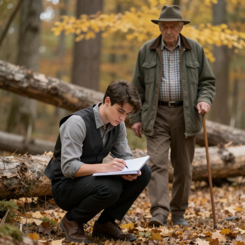Man in checkered shirt and wide-brimmed hat standing in forest, looking to the side. Long line of bee hives in foreground, sunlight filtering through trees, misty atmosphere. Dense greenery, tall trees. Soft, neutral facial expression.