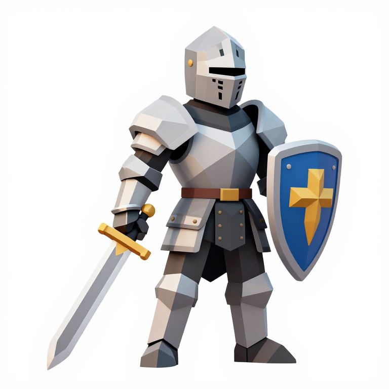 Thumbnail Style: Low Poly 3D Character Design Content: Create a game asset of a stylized knight in shining armor, wielding a sword and shield, standing in a heroic pose on a white background.,