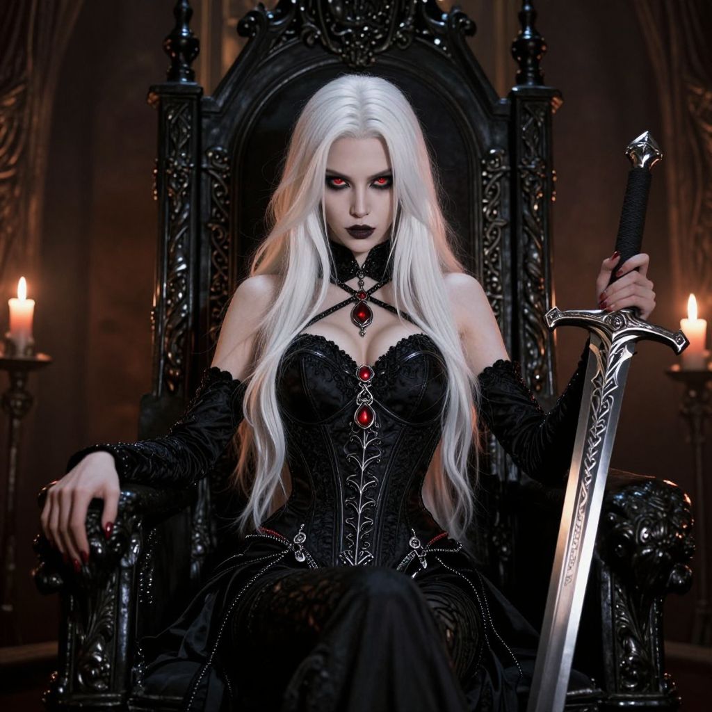Digital art of a pale-skinned, white-haired woman with red eyes, black gothic dress, holding a sword, seated on a dark, orn
