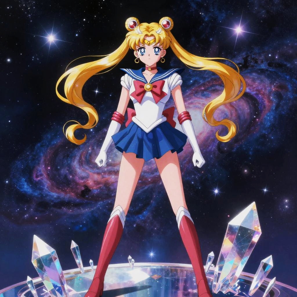Digital anime illustration of Sailor Moon with long blonde twin-tails, blue sailor uniform, red boots, standing on crystal pedestal against a starry, colorful