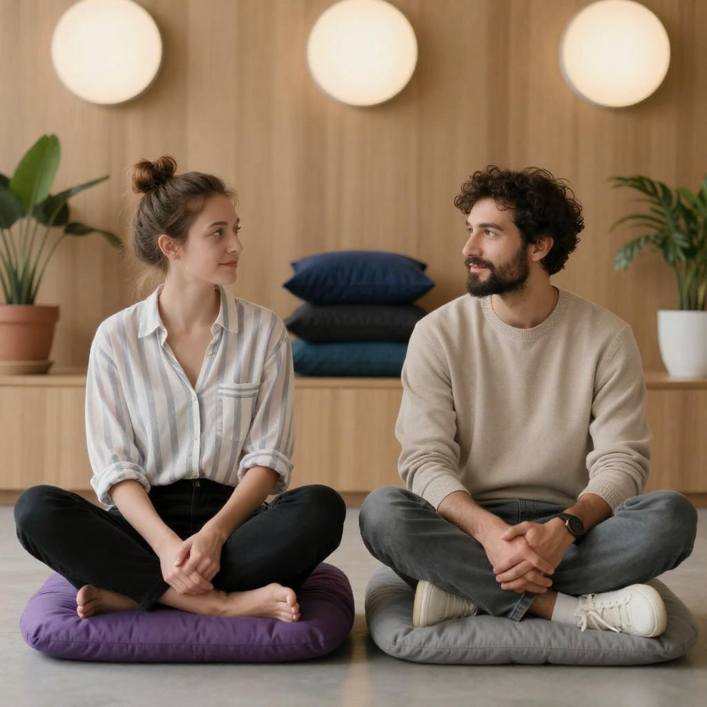 Photograph of two people, a woman with a bun and striped shirt, and a bearded man with dark hair and beige sweater, sitting cross-legged on purple and gray cushions in a modern, wood-paneled room with round white lights, potted plants, and stacked blue and black pillows in the background.