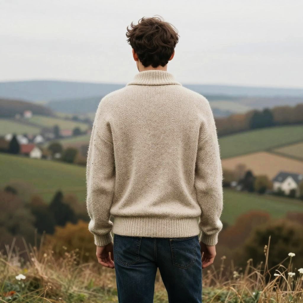Man Knit Sweater, man in a sweater standing on a hill overlooking a valley