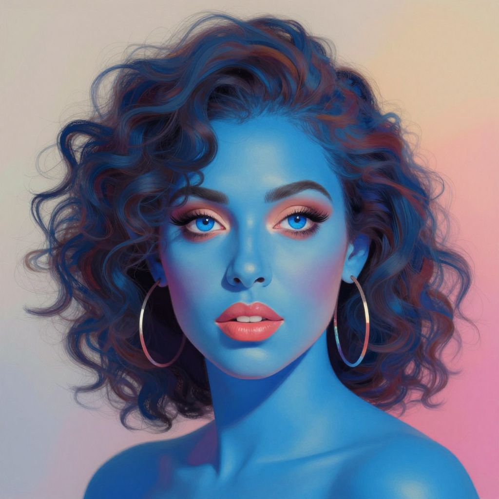 This digital artwork portrays a striking portrait of a woman with vibrant blue skin, curly black hair, and bold makeup. She has bright orange eyeshadow, long eyelashes, and vivid orange lipstick. Her blue skin contrasts with the white background, making her features stand out. She wears large, thin, gold hoop earrings. The image has a surreal, hyper-realistic style with vivid colors and smooth textures. The woman's intense, direct gaze is centered in the frame, drawing immediate attention to her face. The overall composition emphasizes her unique and striking appearance.