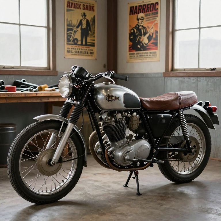Vintage sportster motorcycle in a retro garage setting, vintage posters on the walls, tools scattered on wooden bench, soft natural light coming through windows, realistic materials showcasing metal and leather textures