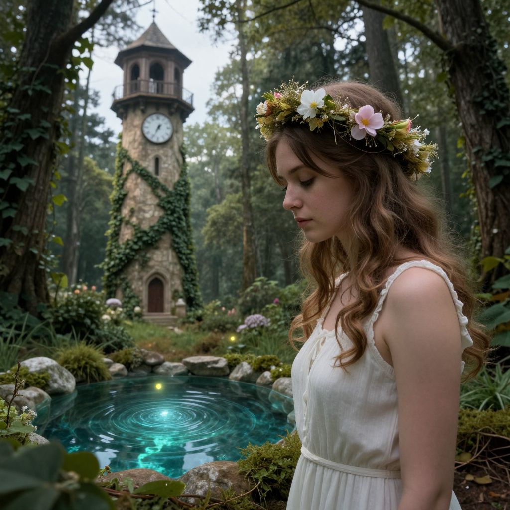 A young woman with a flower crown stands in a mystical forest, her gaze fixed on a crystal-clear pond where a firefly glows, surrounded by ivy and an old high tower with a curved clock stopped at 8.