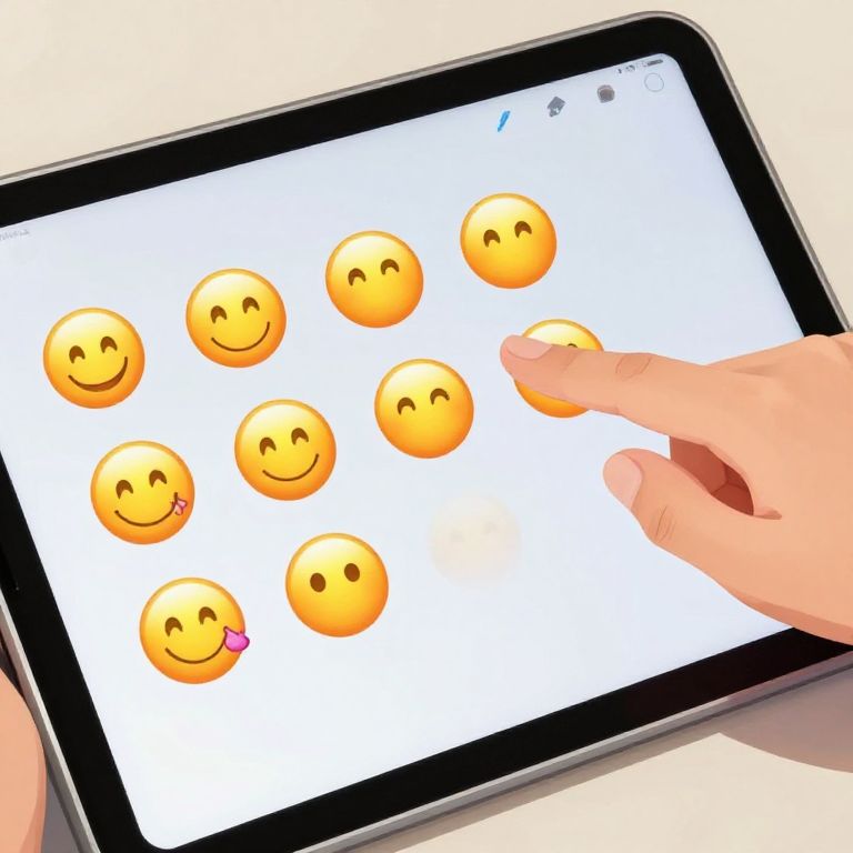 Illustration of a person learning how to delete emoji stickers on a tablet, focus on touch gestures, emoji stickers fading away, smooth gradients, clear and simple visual instructions, friendly tech tutorial vibe