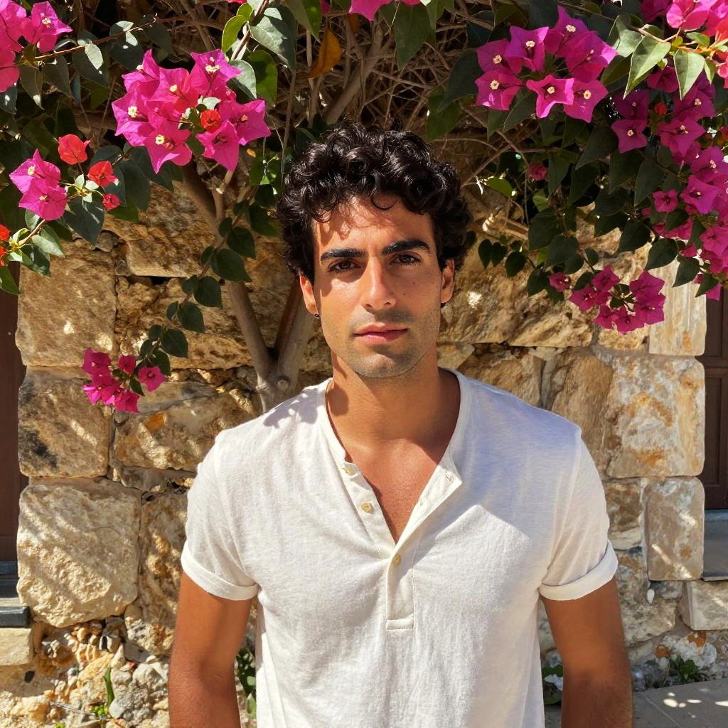 Mediterranean complexion man with warm tan skin and dark sharp eyes, wearing casual coastal attire, posed against an ancient stone wall covered with vibrant bougainvillea plants under bright Mediterranean sunlight.