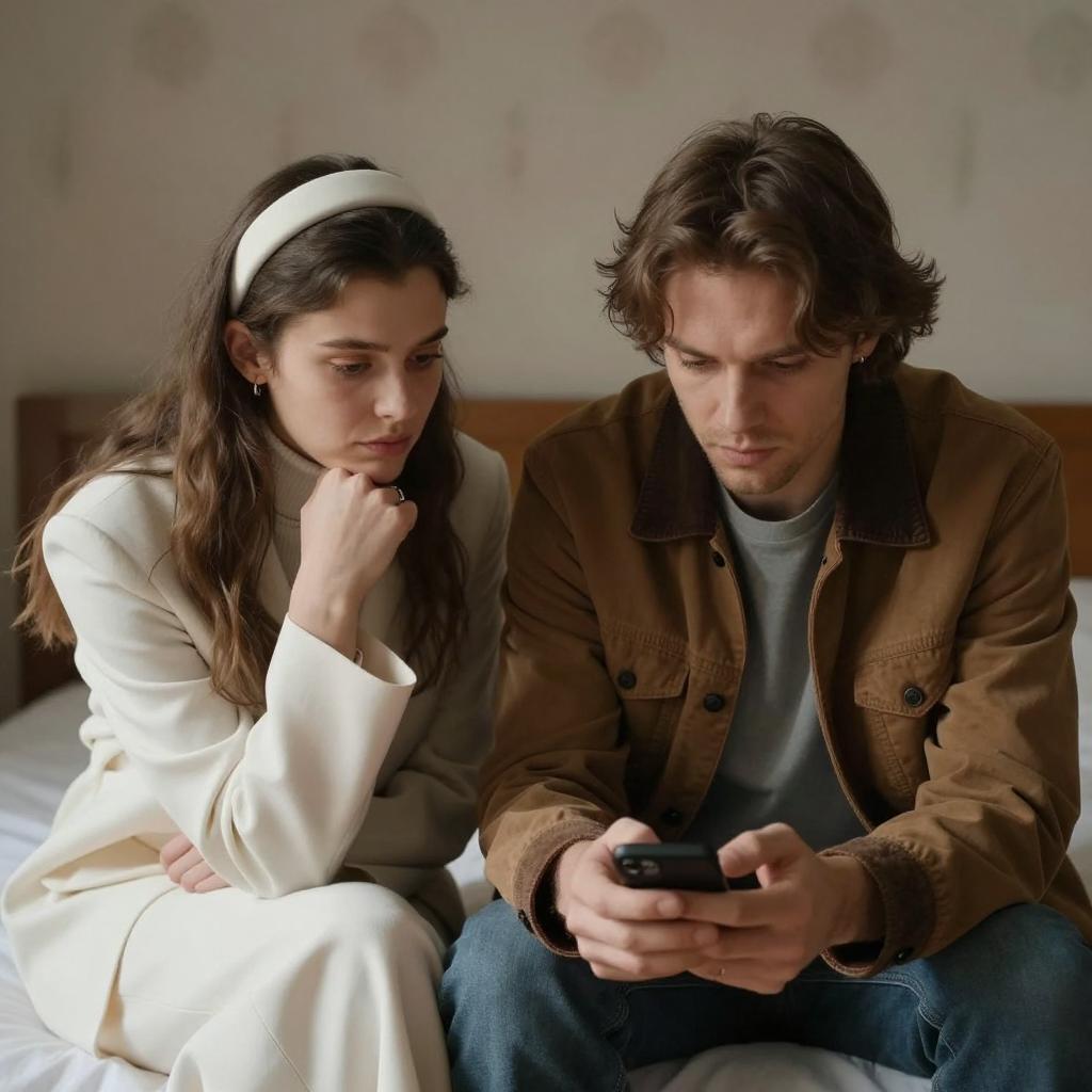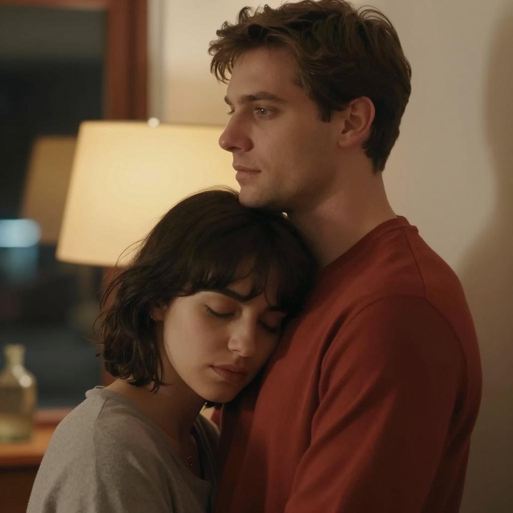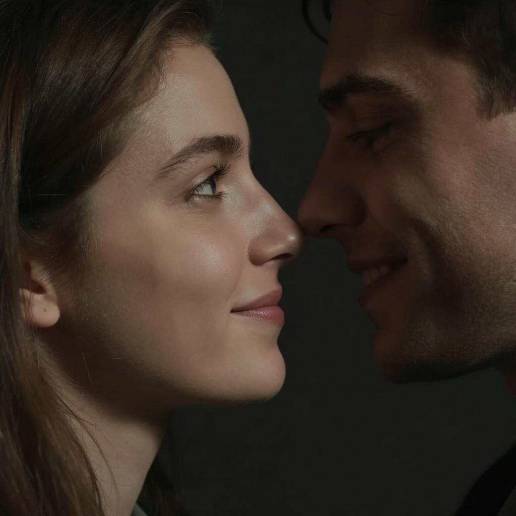 A man and woman in a car at night. Man with tousled brown hair, dark jacket, looks at woman. Woman with straight brown hair, green shirt, and patterned scarf, looks at man. Both hold lit cigarettes, mouths touching tips. Window frame on the left. Dim light casts red glow on man's face.