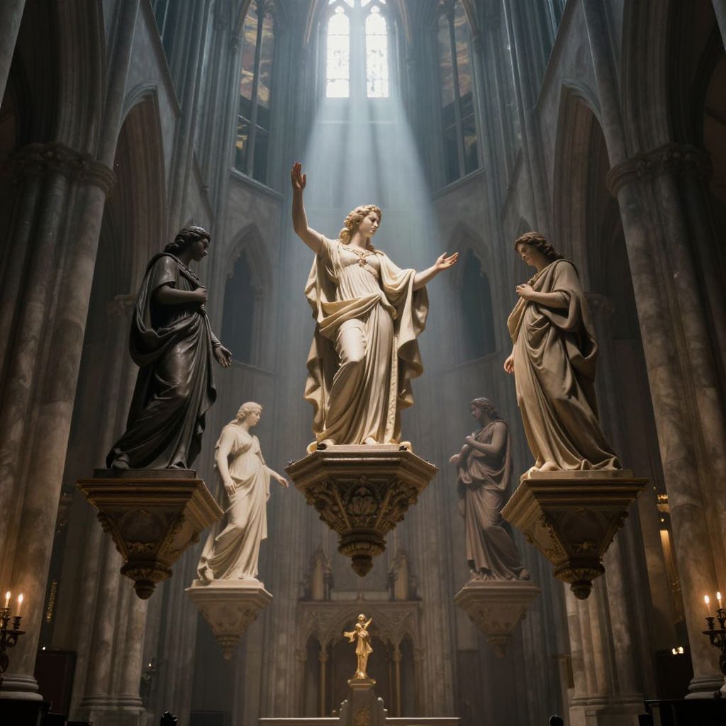 Photograph of a grand cathedral interior featuring four marble statues of robed figures on ornate pedestals. Central figure, illuminated by sunlight streaming through a high, arched window, raises a hand in an expressive gesture. To the left, a dark statue stands in a contemplative pose, while to the right, a statue looks downward. Two smaller statues flank the central figure. The cathedral's tall, gothic arches and columns create a majestic, shadowy backdrop. Candles on either side add a warm glow to the scene.