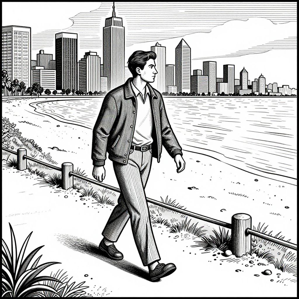 A man in a jacket and pants walks along a beach path with a city skyline in the background, depicted in a Moebius-style illustration.