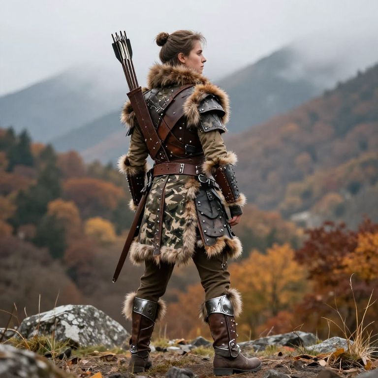 Fantasy archer outfit, rugged hunter style with fur trims and reinforced leather plates, camouflage patterns inspired by autumn forest, sturdy boots with metal accents, broad quiver full of feathered arrows, misty mountainous terrain in background