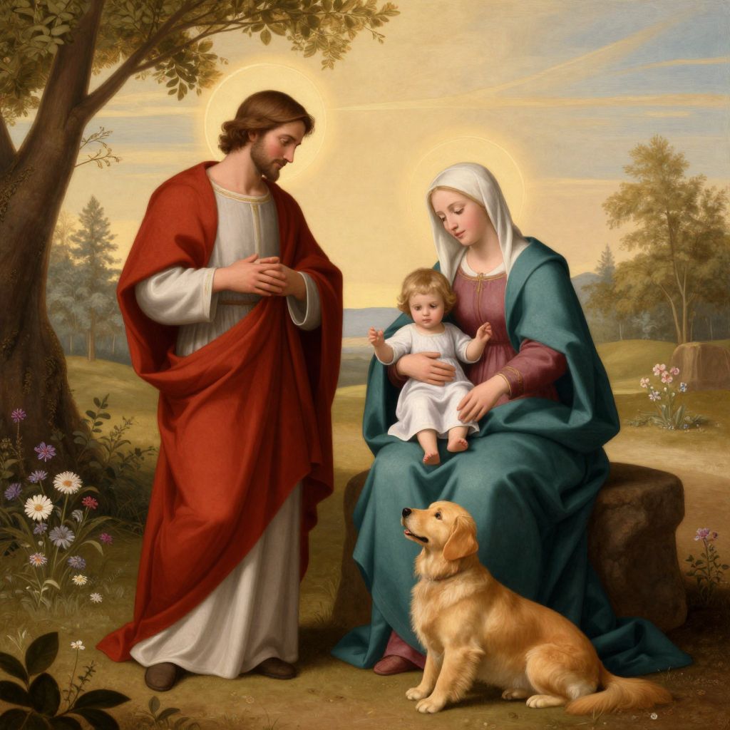 A serene digital artwork depicting a holy family scene, featuring a man in a red robe with a halo, a woman in a teal cloak holding a child, and a golden retriever, all set against a tranquil backdrop of trees, flowers, and soft golden-hour lighting, evoking a classical religious narrative with modern digital artistry.