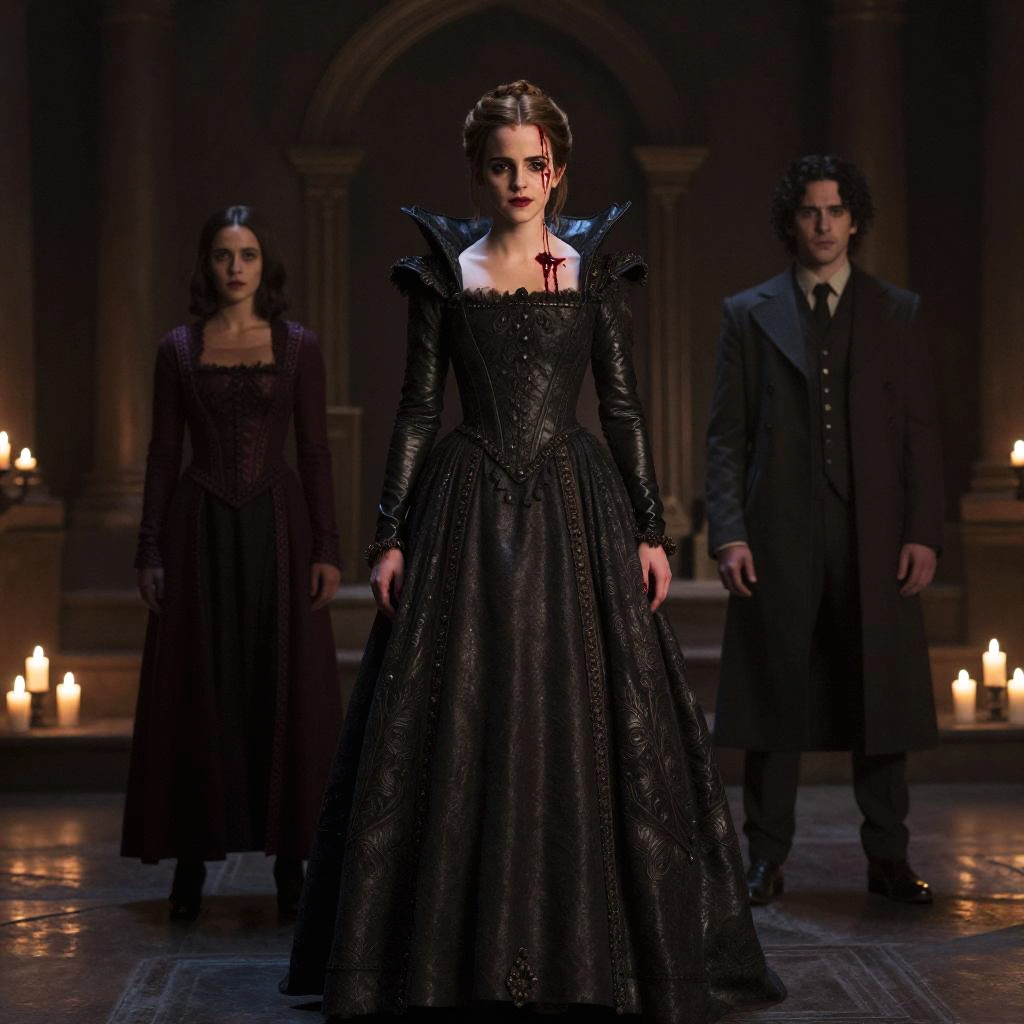 Realistic photo.Emma Watson as a witch queen, black eyes, blood, full body, intricate victorian dress, middle shot, cinematic lighting, symmetrical eyes, rafael albuquerque, charlie bowater, moody lighting, candles realistic photo