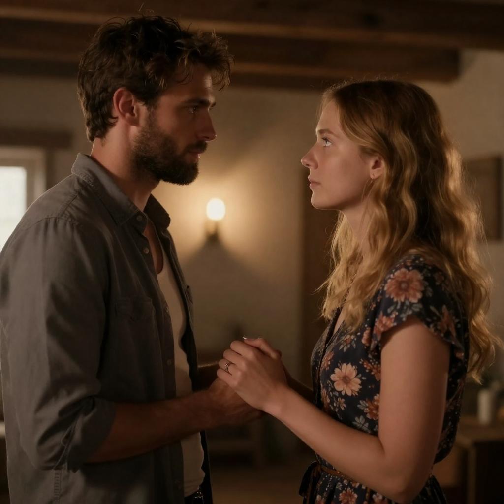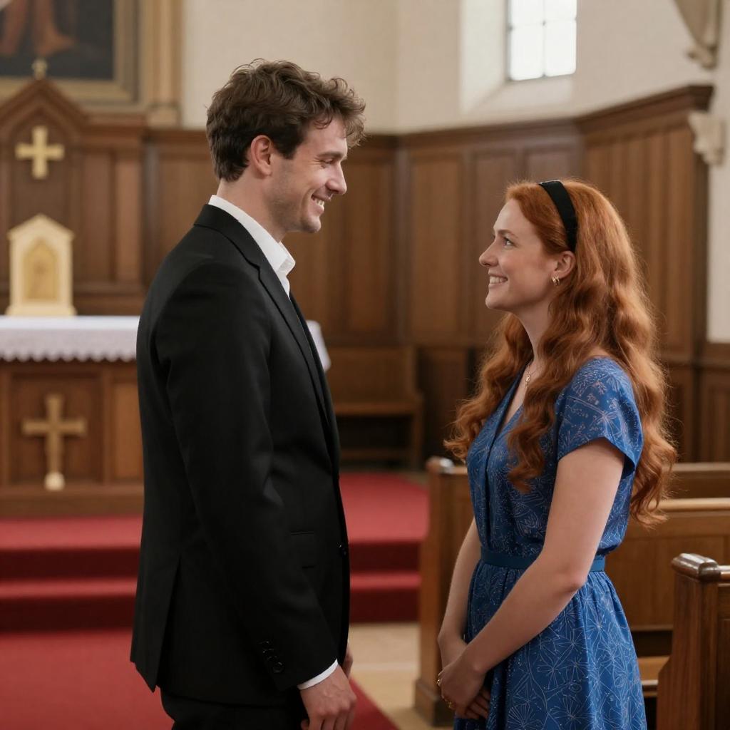 Photograph of a man and woman on a balcony. Woman with short red hair, light blue shirt, looking up at man. Man with curly brown hair, black sleeveless vest, blue patterned shirt, leaning towards her, intense expression. Background includes white railing, green foliage, people on lower level.