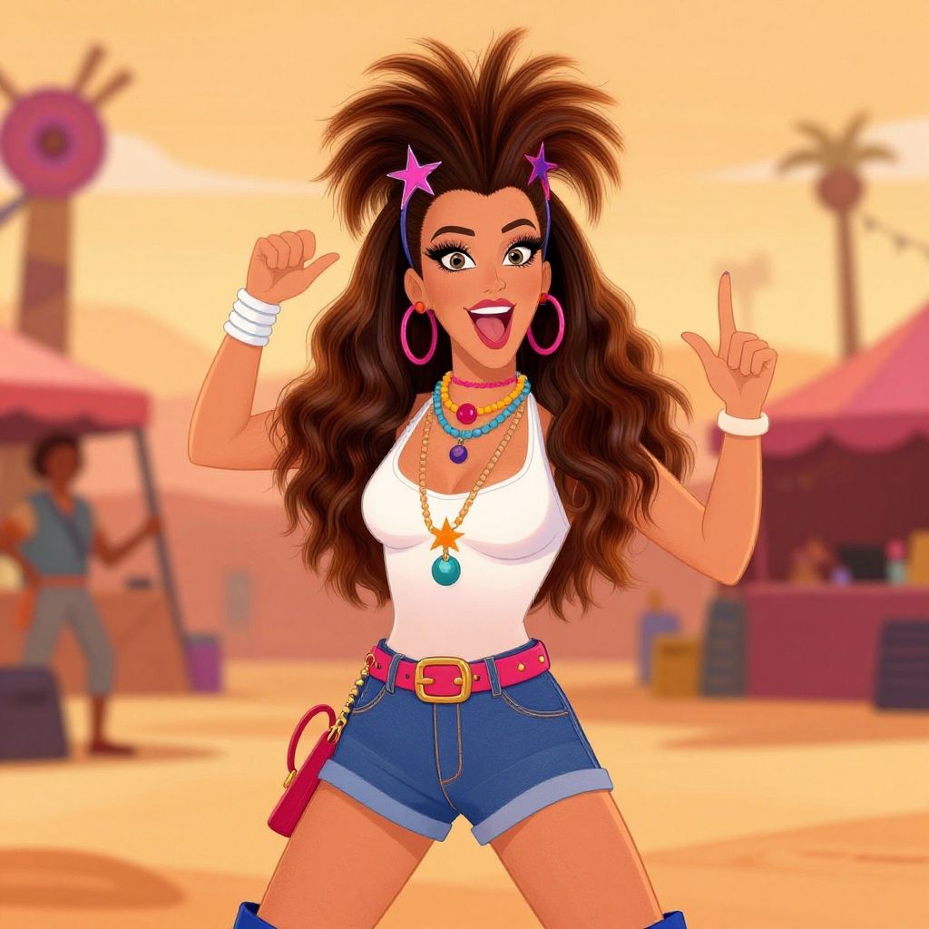 Digital cartoon of a vibrant, tan-skinned woman with voluminous brown hair, wearing a white tank top, blue shorts, jewelry, and star hair