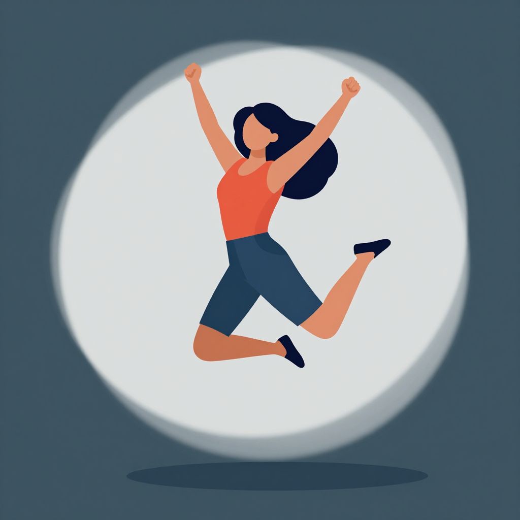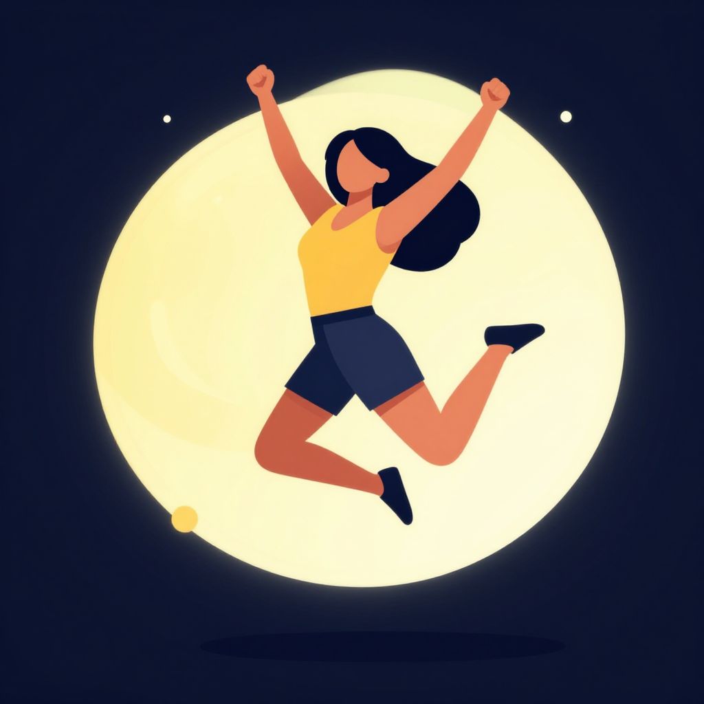 Digital illustration of a joyful woman with dark hair, wearing a yellow sleeveless top and navy blue shorts, jumping with arms raised against a large, glowing white moon in a dark blue night sky. Her silhouette is bold and colorful, with her black shoes and outstretched arms adding dynamic movement. The image has a minimalistic, flat art style, with clean lines and vibrant colors, emphasizing the contrast between her figure and the luminous moon. Small stars dot the background, enhancing the nighttime setting.