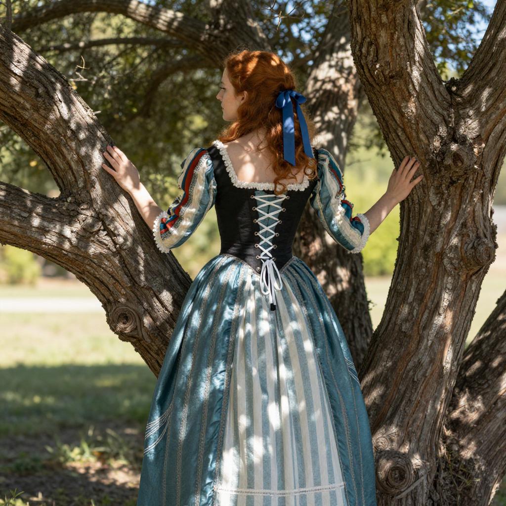 Photograph of a woman with fair skin and red hair in an elaborate, Renaissance-style dress. She stands with her back to the camera, her right hand resting on a large, twisted tree trunk. Her dress features a black corset with white lacing, teal and white striped skirt, and a blue ribbon in her hair. Sunlight filters through the tree branches, casting dappled shadows.