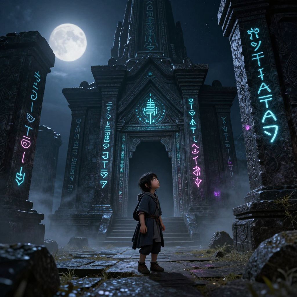 Digital artwork of a child in dark clothing standing before a glowing, ancient temple with neon script, full moon, and mist.